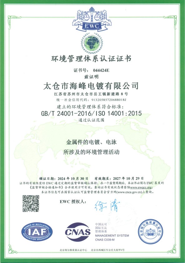 环境管理体系认证证书